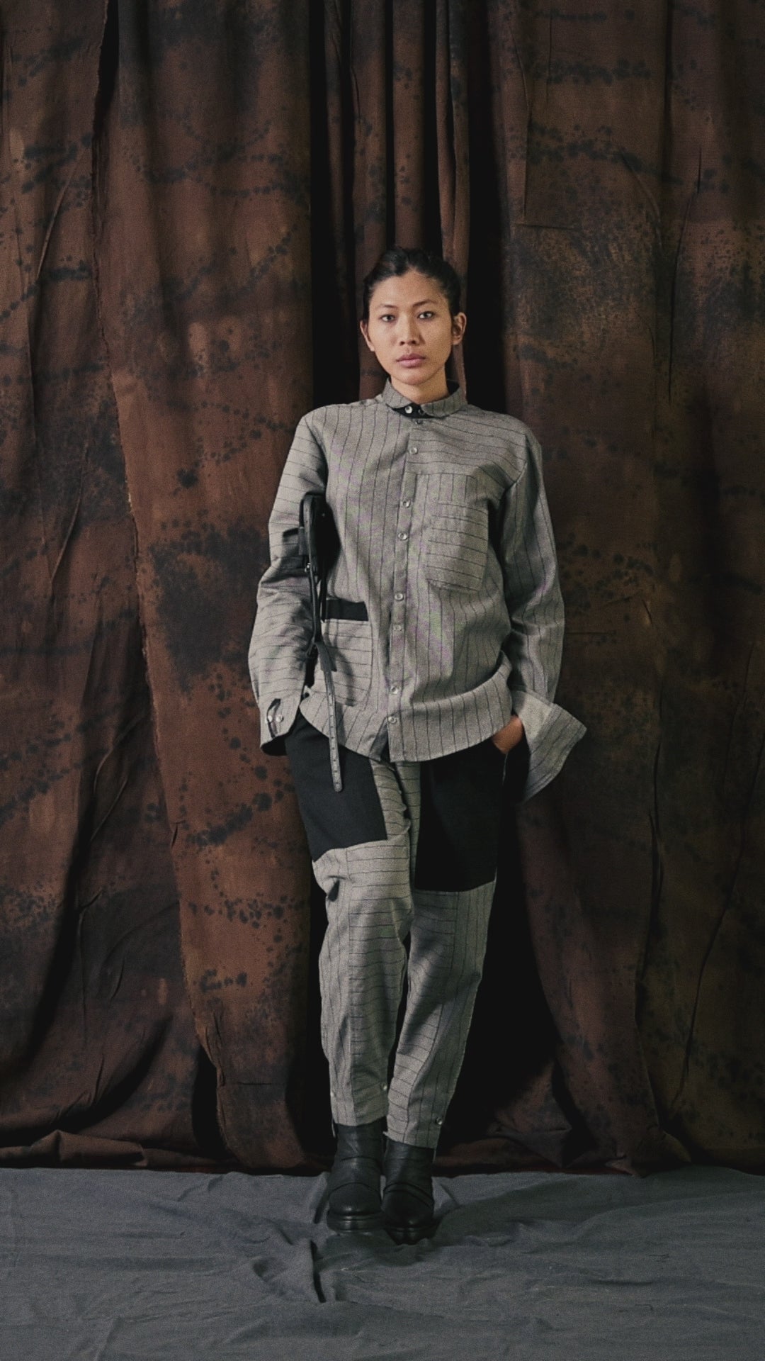 The Nighthob Shirt is a unisex statement piece crafted from 100% cotton denim, blending horizontal and vertical stripes for a refined avantgarde look. With its transformative collar, unique cuff closure, and sleek metal buttons, it embodies modern craftsmanship, conscious production, and timeless individuality.