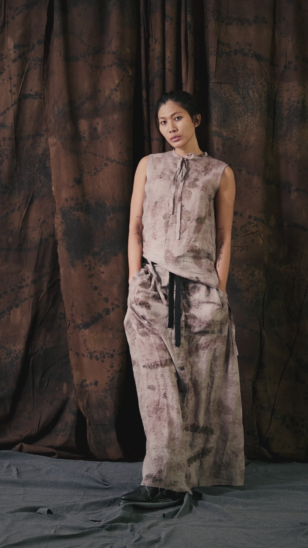 The Whistle Skirt, crafted from a light linen and silk mix, combines fluid elegance with timeless design. Featuring pleating along the waistband, a front button panel, and side pockets, it showcases a soft light purple eco print that enhances its refined, sustainable aesthetic.