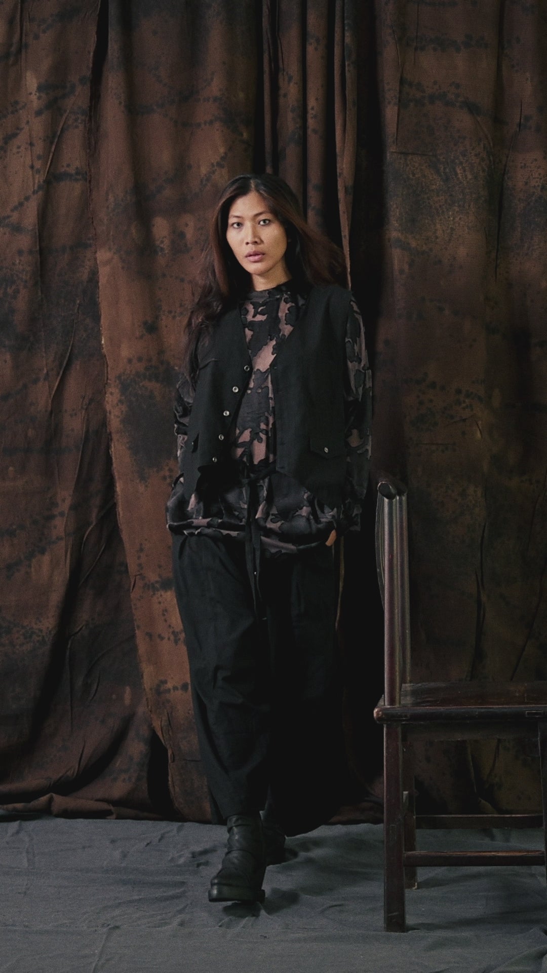 • Features: Neck and back strings, back cut-out with drawstring, long sleeves with elastic cuffs