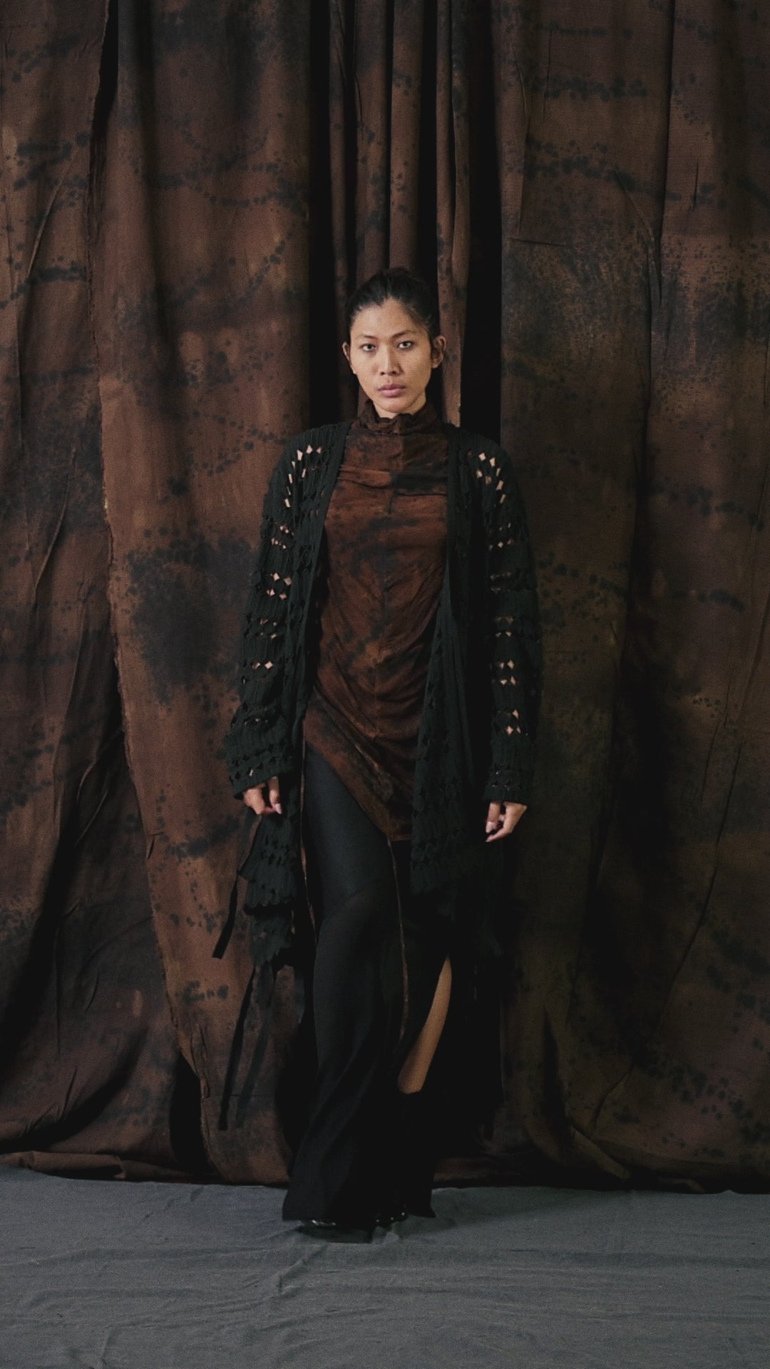 The Kintamani Coat, crafted from thick cotton lace and lined with a cotton–linen blend, merges 19th-century elegance with modern gothic sensibility. Its A-line loose fit, string closures, and side slits create a flowing, gender-free silhouette inspired by traditional kimono shapes and dark avantgarde aesthetics.